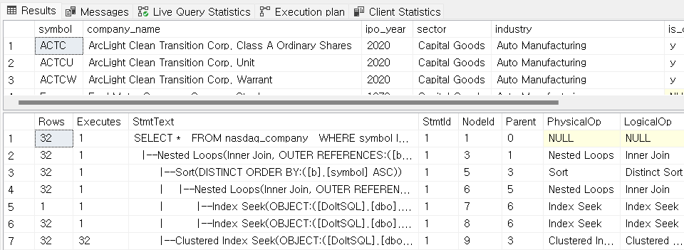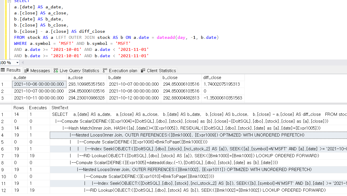 | |--Index Seek( OBJECT:([DoItSQL].[dbo].[stock].[nci_stock_2] AS [b]), SEEK:([b].[symbol]=N'MSFT' AND [b].[date] >= '2021-10-01 00:00:00.000' AND [b].[date] < '2021-11-01 00:00:00.000') ORDERED FORWARD) [DoItSQL].[dbo].[stock].[nci_stock_2]는 사용된 인덱스 이 인덱스는 [DoItSQL].[dbo].[stock] 테이블에 있는 **nci_stock_2**라는 이름의 인덱스 AS [b]는 이 인덱스가 **테이블 별칭(b)**으로 참조 |