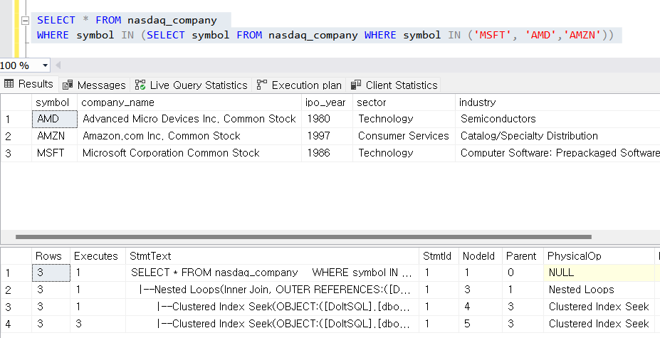Clustered Index Seek 연산은 클러스터된 인덱스를 사용하여 특정 symbol 값(즉, 'AMD', 'AMZN', 'MSFT')을 가진 데이터를 효율적으로 검색하는 과정 |
