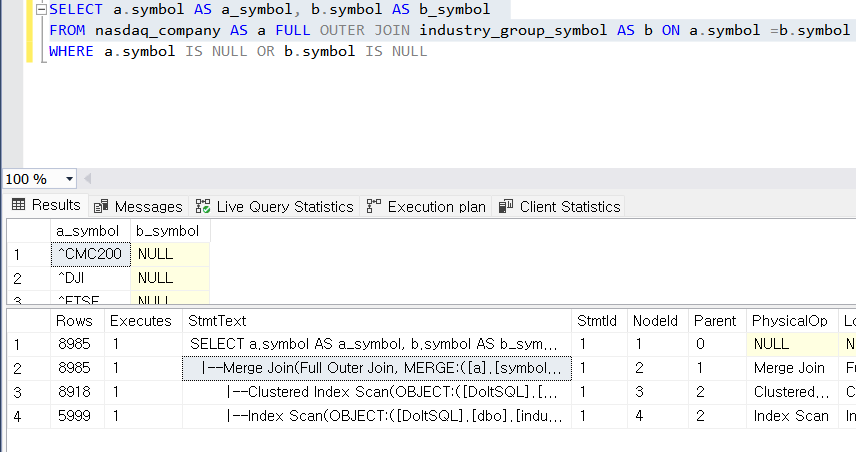 Clustered Index Scan 연산은 [DoItSQL].[dbo].[nasdaq_company] 테이블에서 정의된 클러스터드 인덱스를 사용하여, 테이블의 모든 데이터를 순차적으로 스캔하는 작업입니다. 데이터는 오름차순으로 정렬된 순서로 스캔되며, 특정 조건 없이 테이블을 전부 탐색하는 경우에 주로 발생 Index Scan 연산은 [DoItSQL].[dbo].[industry_group_symbol] 테이블의 nci_industry_group_symbol_2 비클러스터드 인덱스를 사용하여, 전체 인덱스를 순차적으로 스캔하는 작업을 수행 검색은 오름차순으로 이루어지며, 인덱스의 모든 항목을 읽음 인덱스에 저장된 모든 데이터를 탐색할 필요가 있을 때, 혹은 적절한 필터링 조건이 없거나 너무 많은 데이터를 포함하는 경우 이 연산이 발생할 수 있으며, 성능에 부정적인 영향 **Merge Join**은 정렬된 두 입력 집합을 병합 조인 방식 이 조인은 일반적으로 정렬된 데이터를 기반으로 수행되며, 조인 조건에 따라 두 집합을 병합한 결과 **Left Outer Join**은 왼쪽 테이블의 모든 행을 반환하고, 오른쪽 테이블에서 일치하는 행이 없으면 NULL을 반환하는 조인 방식 이 경우, [a].[symbol] 값이 왼쪽 테이블에 존재하면, 오른쪽 테이블에 매칭되는 값이 없어도 반환됨 |