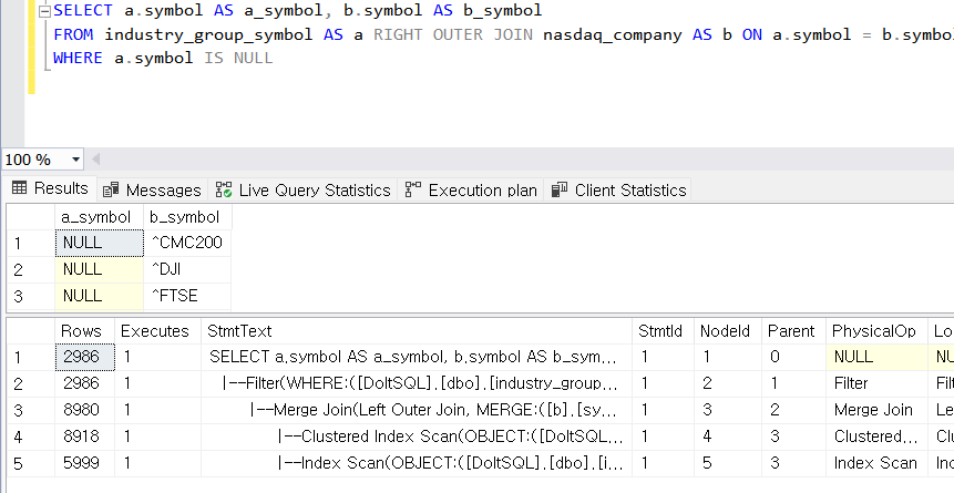 | 퀴즈 2. nasdaq_company 테이블에서 industry_group_symbol 테이블에 포함되지 않는 symbol, industry, company_name 목록을 검색 | where s_b.symbol is null select a.symbol, a.industry, a.company_name from nasdaq_company as a left outer join industry_group_symbol as b on a.symbol = b.symbol |